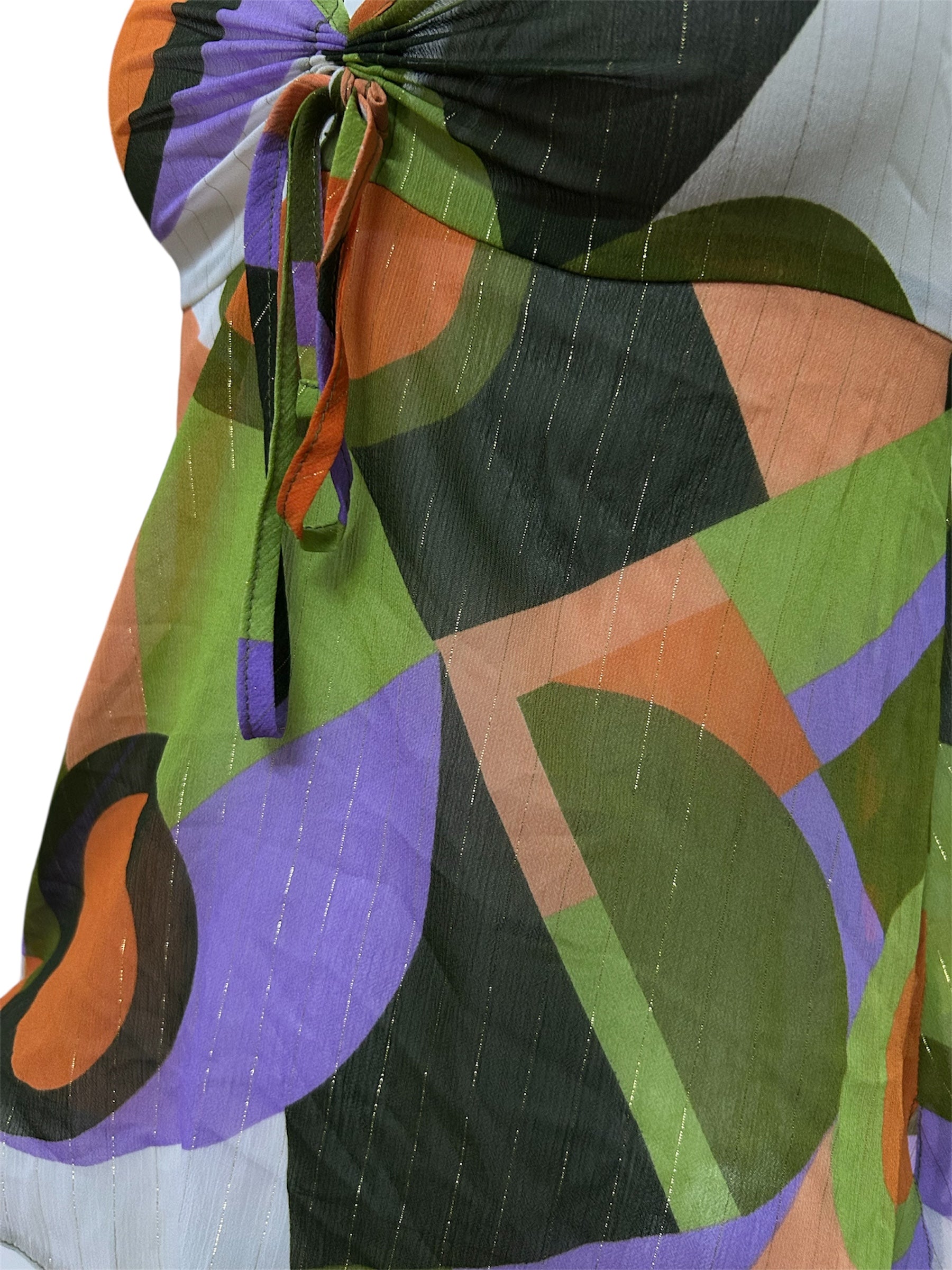 Color: Orange, Green, Purple and Olive Green funky geometric design with gold threads.
